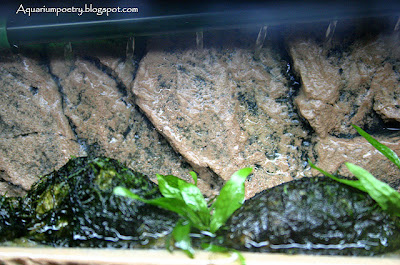 This paludarium has been running just fine. How do I know that? Well the photo above is telling a story on its own ;-) One of the female Pseudosesarma moeshi has eggs again! I have seen 1 male and another female present, but the 4th crab is still somewhere hiding. I wouldn't say it is dead. It is easy to discover a dead crab... follow your nose, it does smell nasty. I am sure it is still alive. Sometimes it is very hard to see the crabs, they prefer being safe behind the rocks.My Golden Apple Snails are doing fine. 2 of them are very active, while the 3rd one seem to be closed most of the time. I checked and it is alive.
